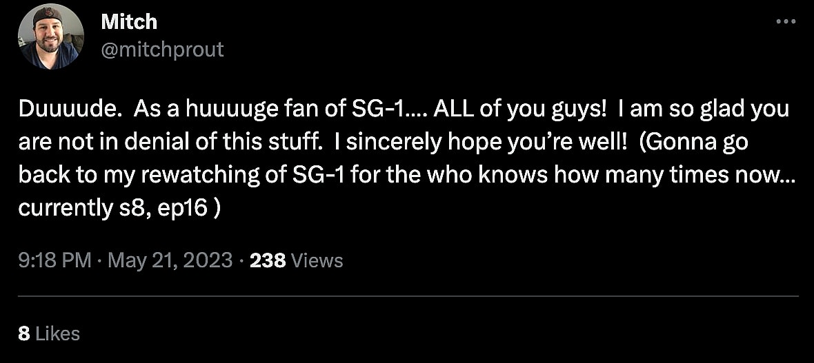 “Duuuude,” ecstatically prefaced @mitchprout. “As a huuuuge fan of SG-1…. ALL of you guys! I am so glad you are not in denial of this stuff. I sincerely hope you’re well!”