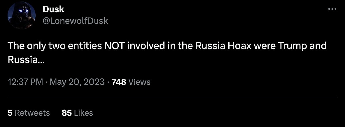 “The only two entities NOT involved in the Russia Hoax were Trump and Russia…” declared @LonewolfDusk.
