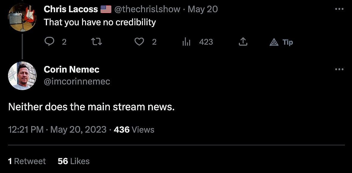“That you have no credibility,” replied a frustrated @thechrislshow to which Nemec gracefully responded with, “Neither does the main stream news.”