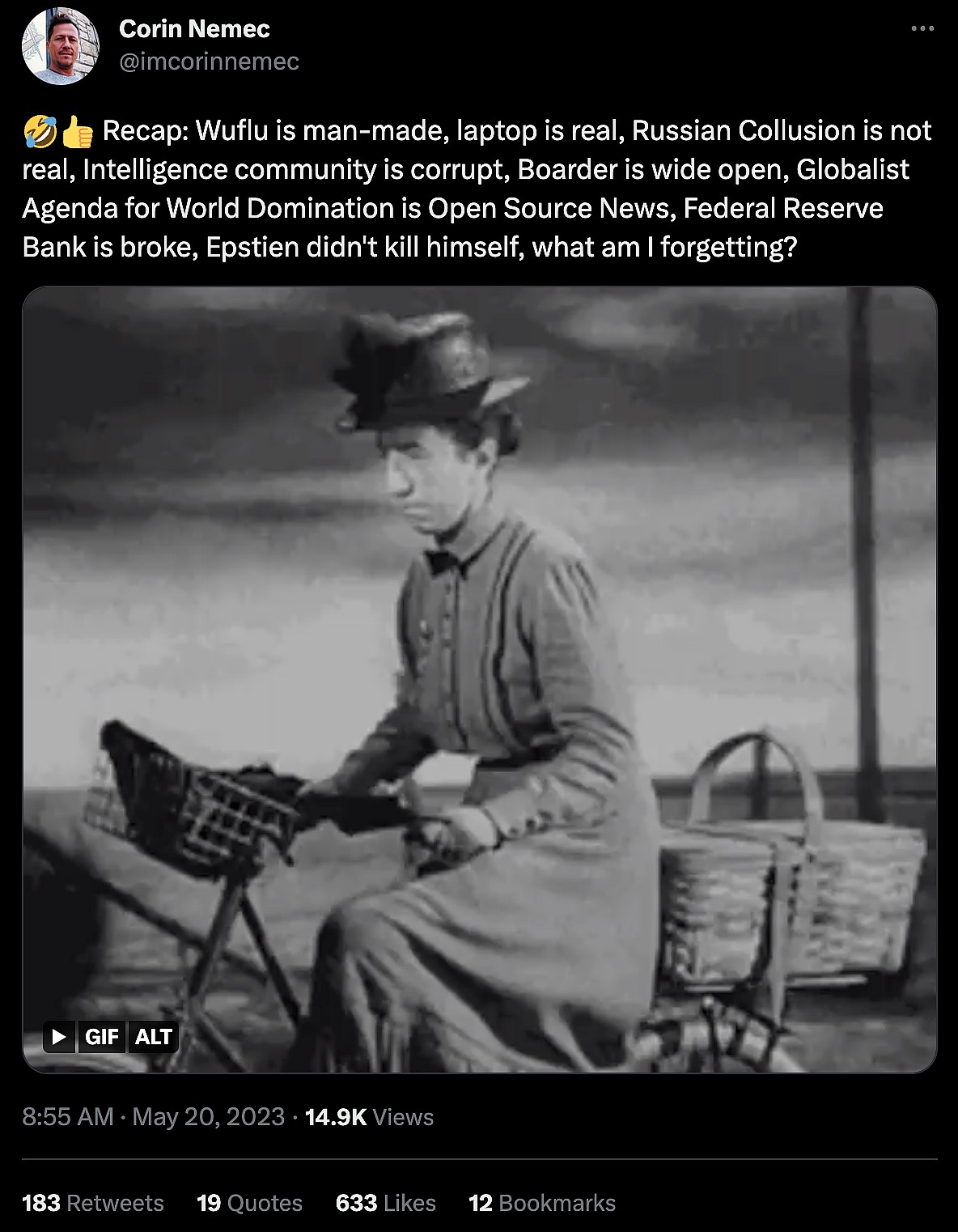 Recapitulating some of the events that have transpired over the last few years, Nemec tweeted on May 20th, “Wuflu is man-made, laptop is real, Russian Collusion is not real, Intelligence community is corrupt, Boarder is wide open, Globalist Agenda for World Domination is Open Source News, Federal Reserve Bank is broke, Epstein didn’t kill himself,” cheekily inquiring, “what am I forgetting?”