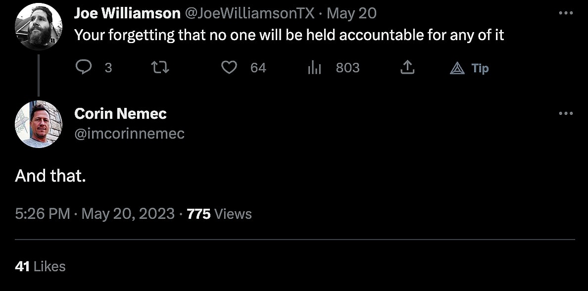 Addressing Nemec’s closing inquiry, Twitter user @JoelWilliamsonTX pointed out, “You’re forgetting that no one will be held accountable for any of it,” prompting the actor to reply “And that” in agreement.