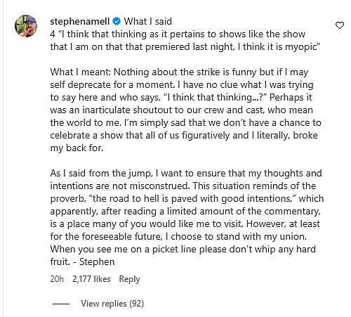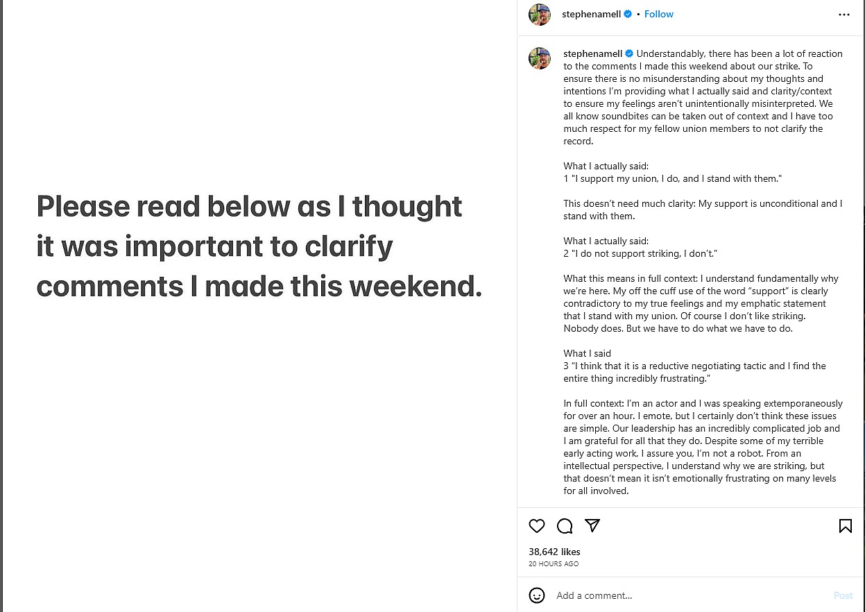 He then explained why he believes striking is a reductive negotiating tactic, “In full context: I’m an actor and I was speaking extemporaneously for over an hour. I emote, but I certainly don’t think these issues are simple. Our leadership has an incredibly complicated job and I am grateful for all that they do.”
