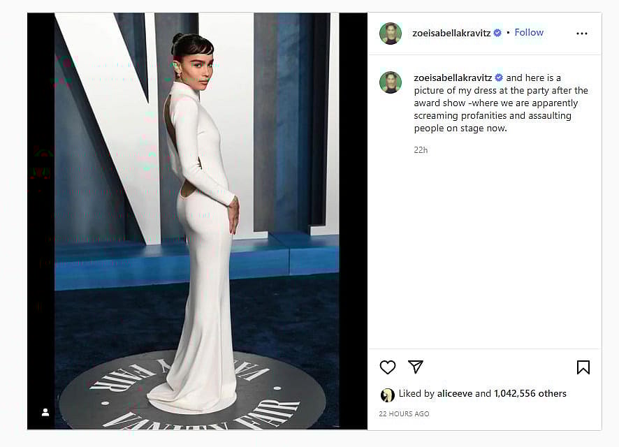 Taking to her personal Instagram account shortly after the ceremony concluded, Kravitz drew the ire of the internet’s more rabid users after criticizing the King Richard star for his emotionally-charged assault in a pair of now-deleted Instagram posts made to her personal account shortly after the ceremony had concluded.