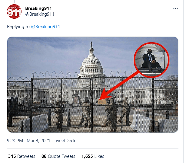 However, his protest was purely a photo op as Breaking 911 shows the Capitol building is completely surrounded by razor-wired fencing as well as armed troops at the time Green was “protesting.”