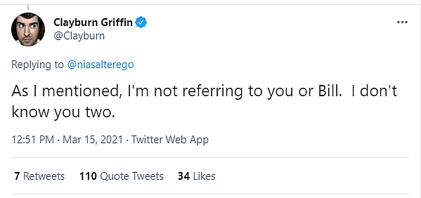 Griffin would respond writing, “As I mentioned, I’m not referring to you or Bill. I don’t know you two.”