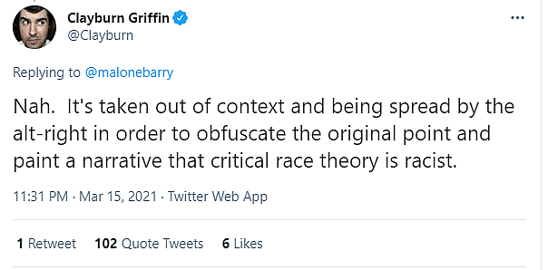 He wrote, “Nah. It’s taken out of context and being spread by the alt-right in order to obfuscate the original point and paint a narrative that critical race theory is racist.”