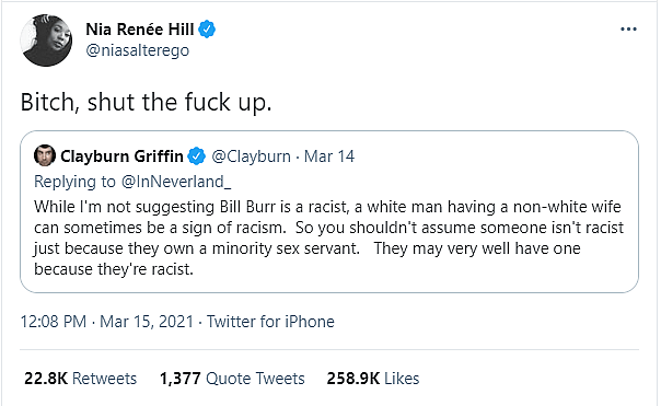 Burr’s wife Nia Renée Hill responded to this initial tweet, writing, “B****, shut the f*** up.”