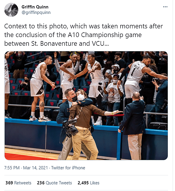 An Atlantic 10 source told Yahoo!, “It was a misunderstanding of access between security and the Bonnes videographer.” The source added, “Security guards, especially in COVID times, are trained to keep media off the court, but this guy was allowed to be out there.”