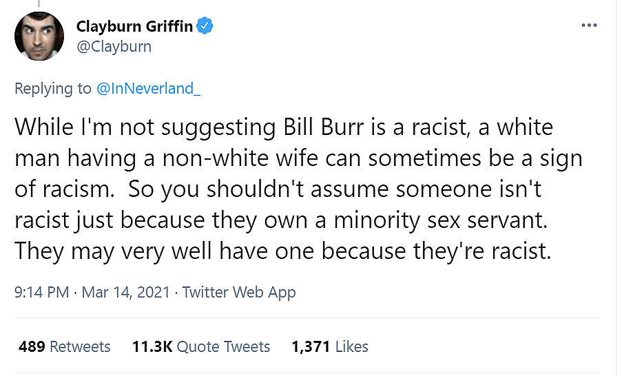First this failed congressional candidate tweeted, “While I’m not suggesting Bill Burr is a racist, a white man having a non-white wife can sometimes be a sign of racism. So you shouldn’t assume someone isn’t racist just because they own a minority sex servant. They may very well have one because they’re racist.”