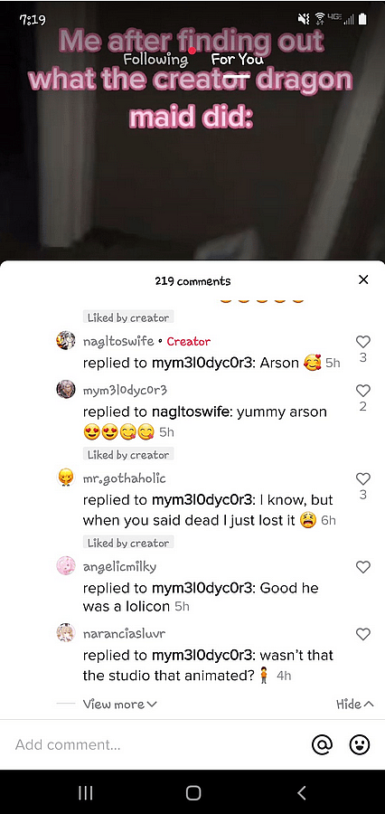In the comments section of a recent TikTok post, in which user nagltoswife expressed disappointment “after finding out” that Miss Kobayashi’s Dragon Maid mangaka Coolkyousinnjya is a fan of lolicon artwork, various users confused the series’ creator with Takemoto and asserted that his particular taste in artwork warranted his death in the KyotoAni fire.