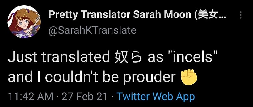 On February 27th, translator Sarah Moon, whose previous work includes the anime series Lovely Complex, announced to her Twitter followers that she had “just translated 奴らas ‘incels’” for the English release of an unidentified video game. “And I couldn’t be prouder,” she boasted.