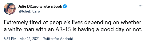 One such user was Deadspin editor Julie DiCaro, who following the shooting, rushed to virtue signal by asserting to her Twitter followers that she was “Extremely tired of people’s lives depending on whether a white man with an AR-15 is having a good day or not,” a reference to the false narrative that Cherokee County Sheriff’s Office Captain Jay Baker described the Atlanta-area spa shootings as the result of the suspect having “a bad day”.