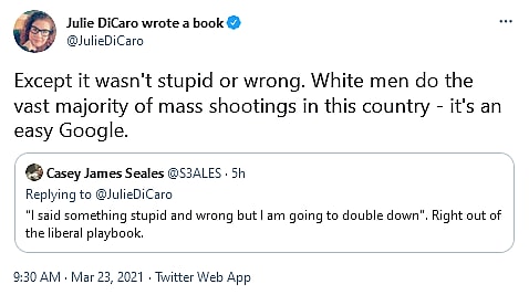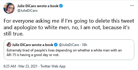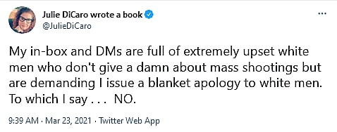 Of course, facts don’t matter to such outright ideologues. “My in-box and DMs are full of extremely upset white men who don’t give a damn about mass shootings but are demanding I issue a blanket apology to white men,” wrote DiCaro on March 23rd. “To which I say . . . NO.”