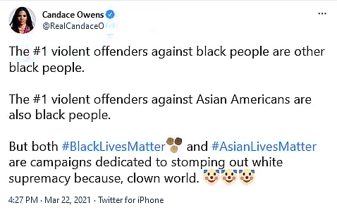 The reply in question was in response to Owens tweeting, “The #1 violent offenders against black people are other black people. The #1 violent offenders against Asian Americans are also black people. But both #BlackLivesMatter and #AsianLivesMatter are campaigns dedicated to stomping out white supremacy because, clown world.”