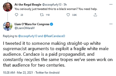 A user named At the Regal Beagle replied to O’ Mara, saying, “You seriously just tweeted this to a black woman? You need help.” O’ Mara would double down, inexplicably accusing Owens of “white supremacist” arguments and calling her a “paid propagandist.”