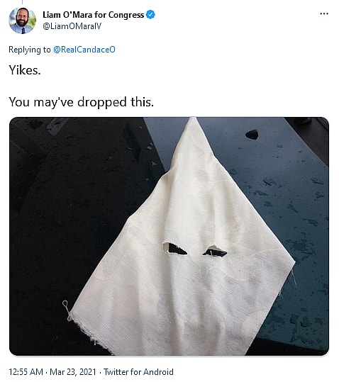 O’ Mara would respond with a terribly racist tweet, showing a picture of a KKK hood, and saying, “Yikes. You may’ve dropped this.”
