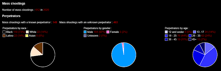 According to Mass-Shootings.info, which catalogues every solved and unsolved mass shooting event in the United States, of the 612 mass shootings that occurred in 2020, 118 were committed by Black individuals (73%), with 22 apiece for White and Latino individuals (14% each).