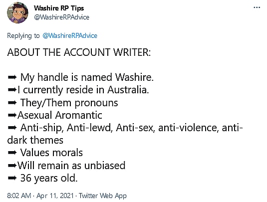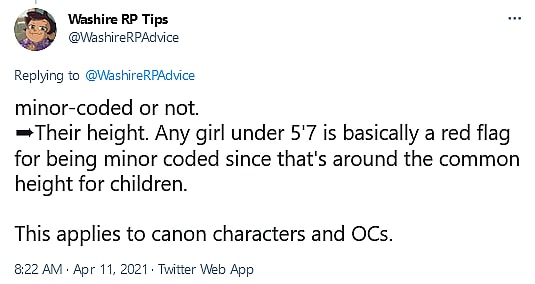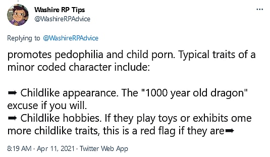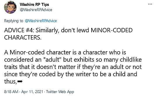 On Twitter, Washite RP Tips wrote, “Don’t lewd MINOR-CODED CHARACTERS. A Minor-coded character is a character who is considered an “adult” but exhibits so many childlike traits that it doesn’t matter if they’re an adult or not since they’re coded by the writer to be a child and thus promotes pedophilia and child porn.”