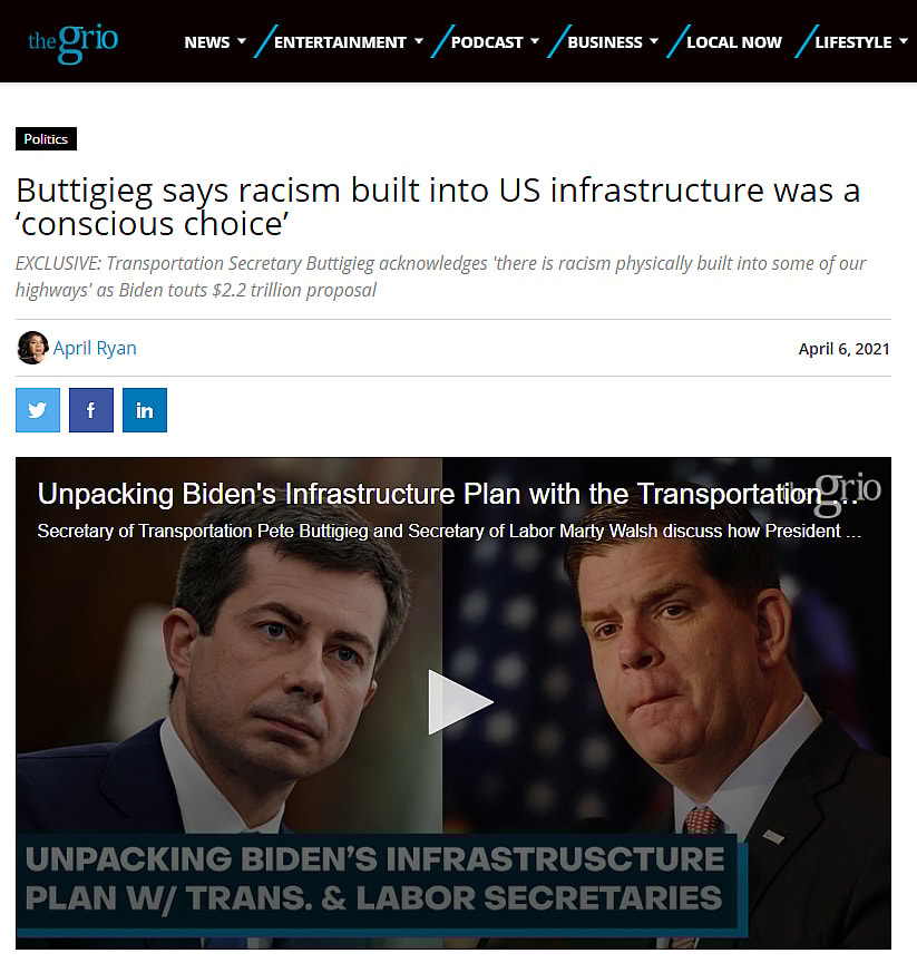 On April 6th, Buttigieg told news outlet theGrio, “Well if you’re in Washington, I’m told that the history of that highway is one that was built at the expense of communities of color in the D.C. area.”