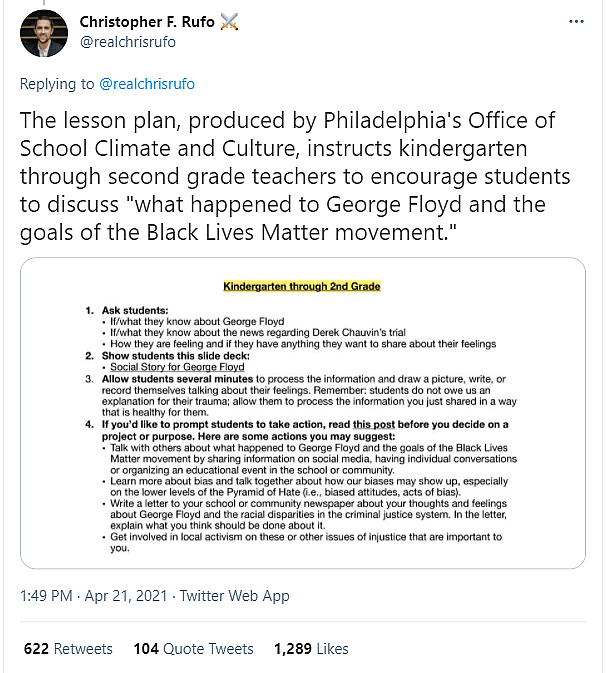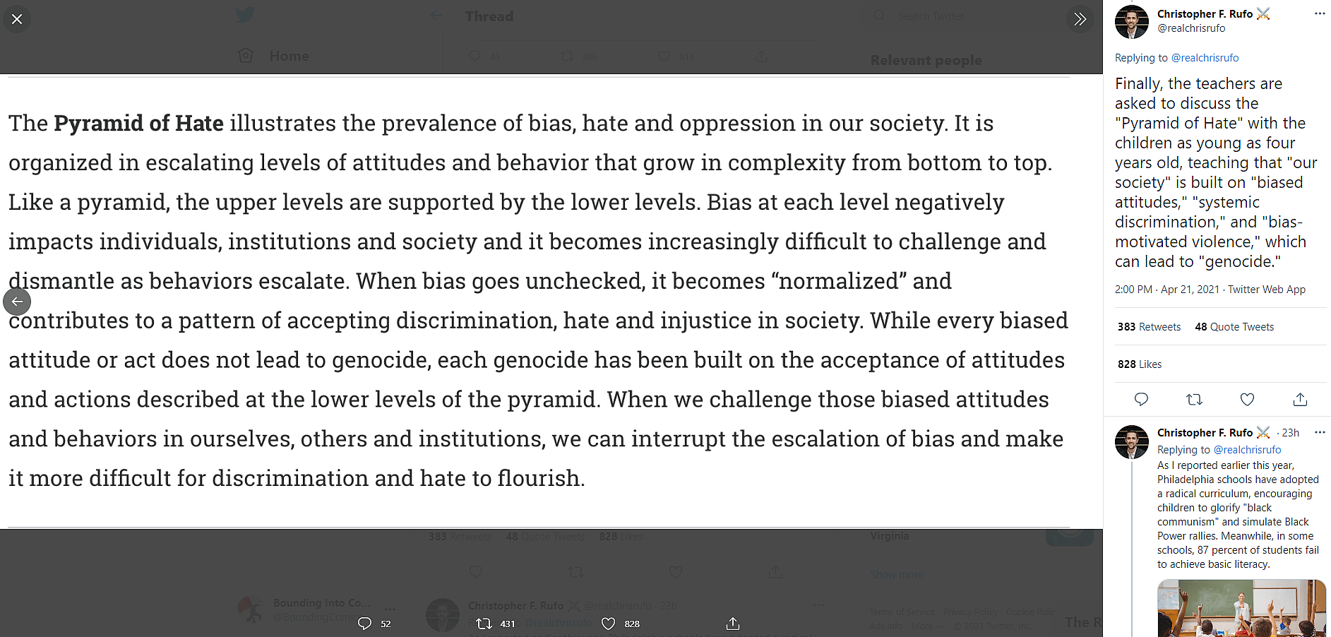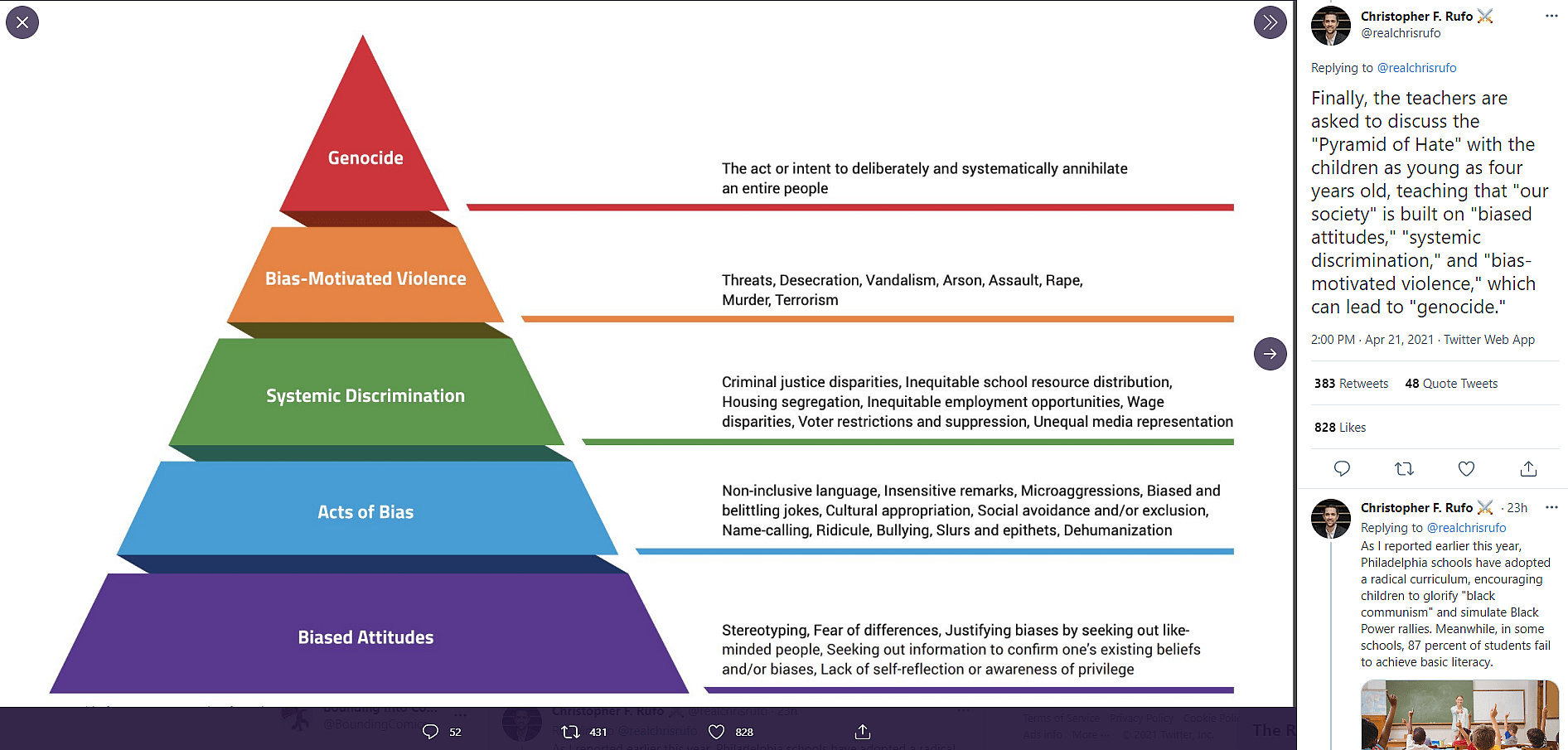 On Twitter, Rufo first revealed that Philadelphia’s Office of School Climate and Culture is instructing students to take action following the verdict in the Derek Chauvin case by teaching them about the Pyramid of Hate.