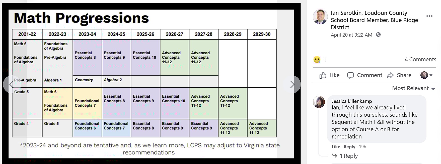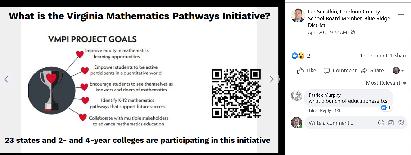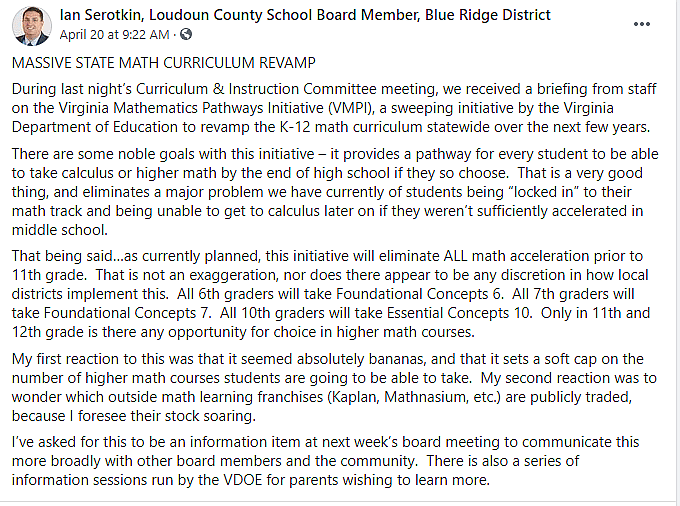Their report is based off of Loudoun County School Board Member Ian Serotkin’s Facebook post about a briefing he received regarding the Virginia Mathematics Pathways Initiative.