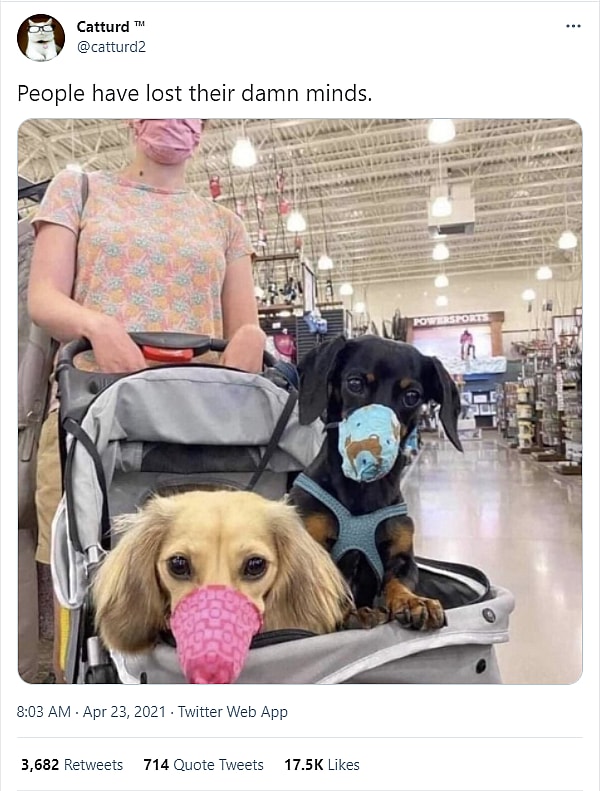 Twitter user Catturd2 shared an image of a woman pushing two masked dogs through some kind of big box store. It looks like a sporting goods store given there are fishing poles behind her and big sign that says Powersports.