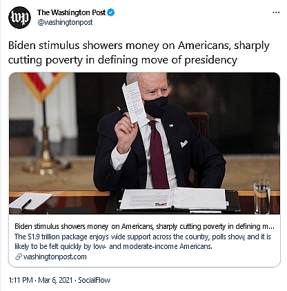 Following the Senate’s decision, in what was one of the most laughable pieces of propaganda published in recent years, The Washington Post announced the relief package’s passing with the condescending headline “Biden stimulus showers money on Americans, sharply cutting poverty in defining move of presidency” (the headline has since been changed to read “Biden stimulus showers money on Americans, sharply cutting poverty and favoring individuals over businesses”, though The Washington Post did not update their article to note this edit).