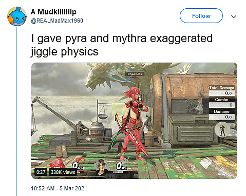On March 5th, Smash modder @REALMadMax1960 revealed to his followers that he had created a new mod which would give “pyra and mythra exaggerated jiggle physics.”