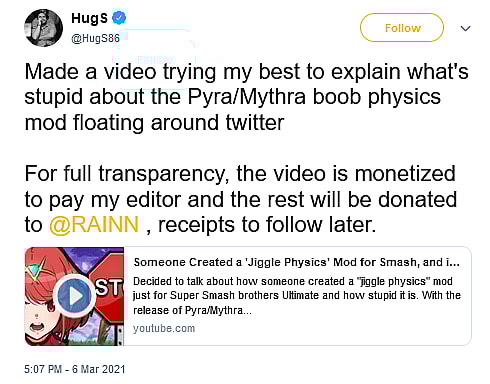 Among the chorus of critics was Pro Smash player @Hugs86, who responded to players who suggested that the mod’s existence ‘wasn’t hurting anyone’ by filming a 14-minute “video trying my best to explain what’s stupid about the Pyra/Mythra boob physics mod floating around twitter“.