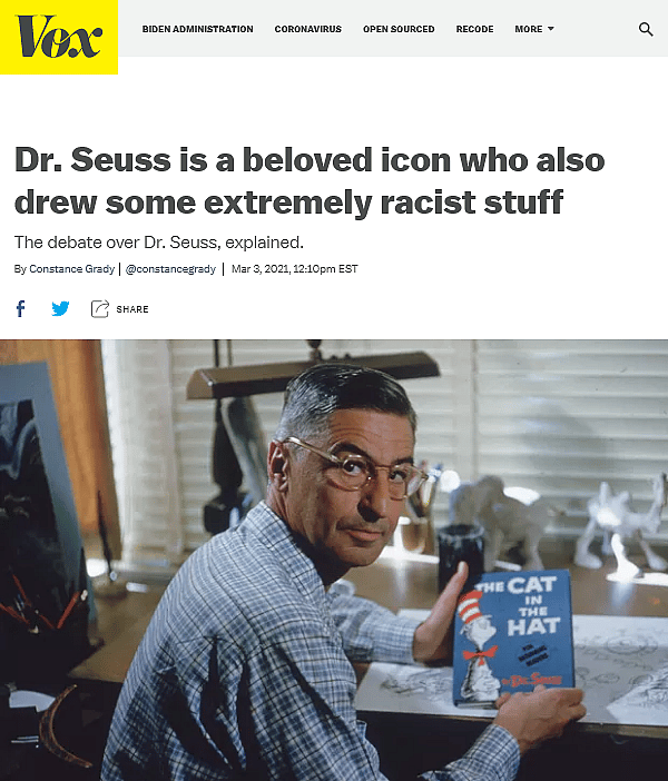 Given how the allegations of racism against Dr. Seuss have taken headlines by storm this past week, it’s no surprise that the performatively progressive Vox News would step forward to add their two cents to the conversation.