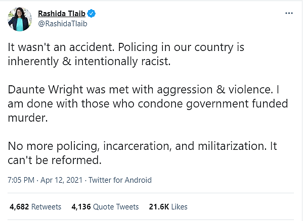 She added, “Daunte Wright was met with aggression & violence. I am done with those who condone government funded murder.”