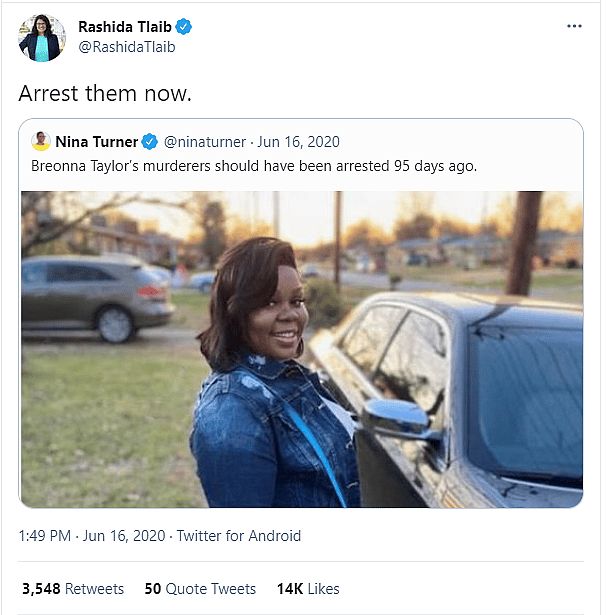 One of the sitting U.S. Congressmen from Michigan, Rashida Tlaib, took to Twitter where she declared policing in the United States “inherently & intentionally racist.”