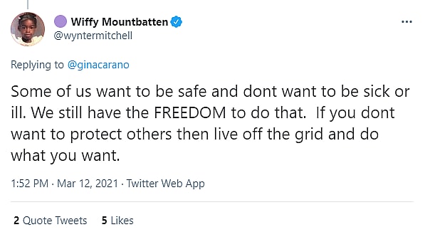 Mitchell-Rohrbaugh responded, “Some of us want to be safe and dont want to be sick or ill. We still have the FREEDOM to do that. If you dont want to protect others then live off the grid and do what you want.”