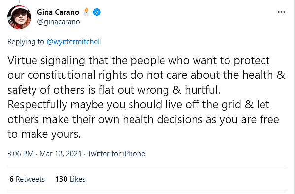 Carano then stated, “Virtue signaling that the people who want to protect our constitutional rights do not care about the health & safety of others is flat out wrong & hurtful. Respectfully maybe you should live off the grid & let others make their own health decisions as you are free to make yours.”