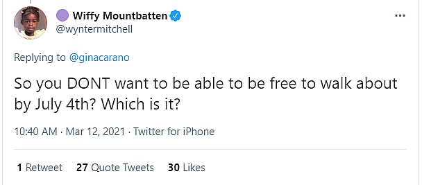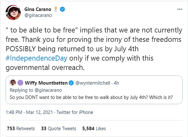 In response to Carano’s tweet, Mitchell-Rohrbaugh tweeted, “So you DONT want to be able to be free to walk about by July 4th? Which is it?”