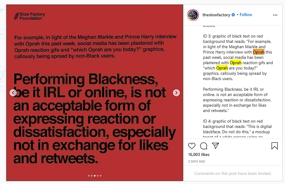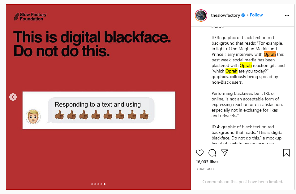 Another image shares an example meme of Oprah from her interview with Meghan and Harry. The Slow Factory Foundation writes, “This is digital blackface. Do not do this.”