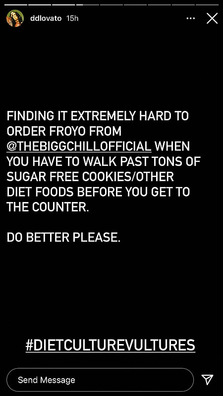 On April 18th, Lovato called out The Big Chill, an LA-based frozen yogurt shop, because the celebrity found it “extremely hard to order from @thebigchillofficial when you have to walk past tons of sugar free cookies/other diet foods before you get to the counter.”