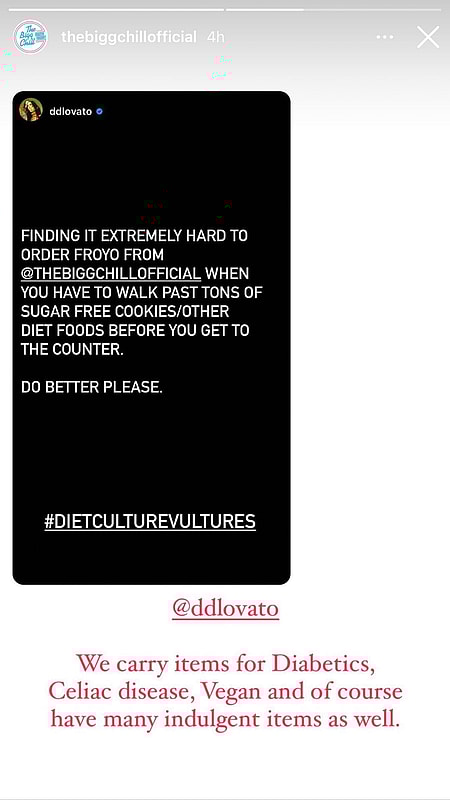 The Big Chill would later clarify directly to Lovato that “We carry items for Diabetics, Celiac disease, Vegan and of course have many indulgent items as well.”