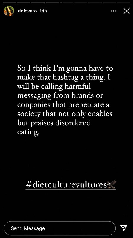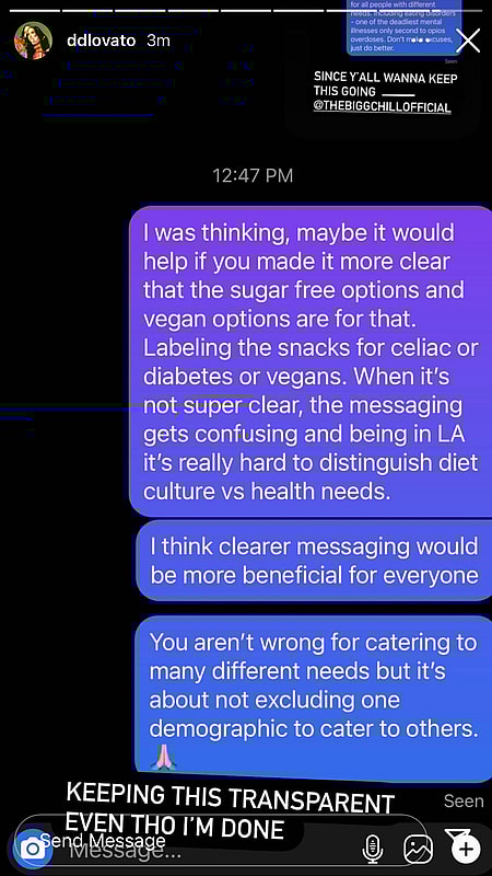 However, Lovato refused to admit that she was in the wrong, doubling down on her belief that she had some sort of moral high ground by declaring that The Big Chill had inspired her start the hashtag #dietculturevultures to refer to “harmful messaging from brands or companies [sic] that perpetuate a society that not only enables but praises disorded eating.”