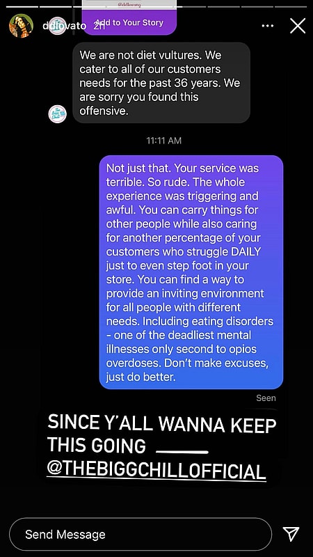 When The Big Chill pushed back and informed Lovato “We are not diet vultures. We cater to all of our customers [sic] needs for the past 36 years. We are sorry you found this offensive”, the singer responded by berating the store for not catering to her bizarre demand.
