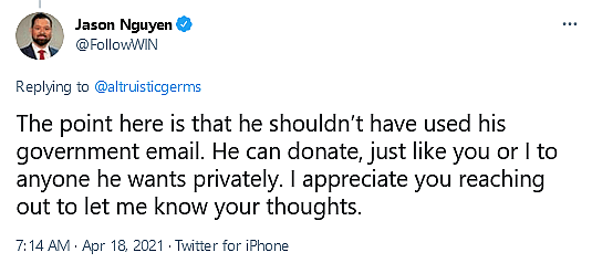When met with backlash for his attempt to shame the paramedic, Nguyen argued that “the point here is that he shouldn’t have used his government email. He can donate, just like you or I to anyone he wants privately,” as if the use of a government email address warranted the public questioning of one’s donations.