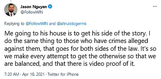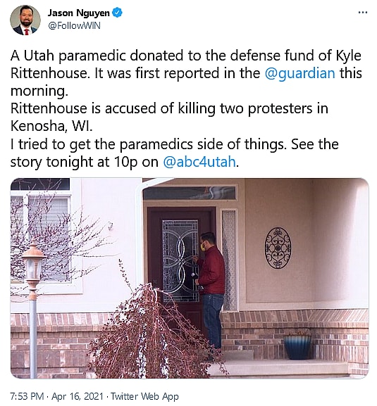 However, not one to be outdone by The Guardian’s public shaming tactics, ABC 4 Utah reporter Jason Nguyen took things a step further, not only going to the man’s house in an attempt to confront him regarding his donation, but also posting a picture of his house on his public Twitter account.
