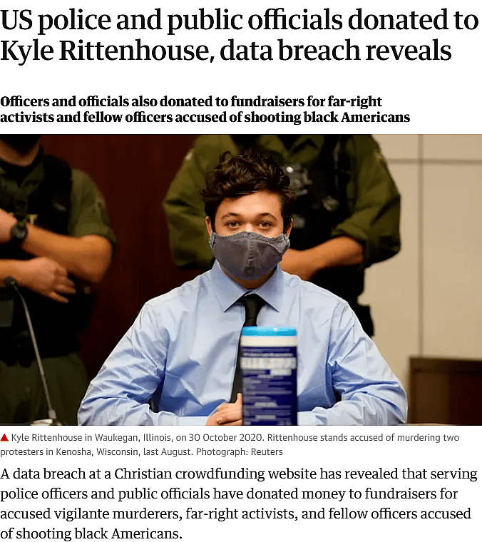 In an April 16th report, The Guardian used information acquired from a “data breach at a Christian crowdfunding website” to publicly identify a number of “serving police officers and public officials [who] have donated money to fundraisers” for individuals the news outlet described as “accused vigilante murderers, far-right activists, and fellow officers accused of shooting black Americans,” as many had used email addresses associated with their jobs in various public government and law enforcement offices to make their donations.