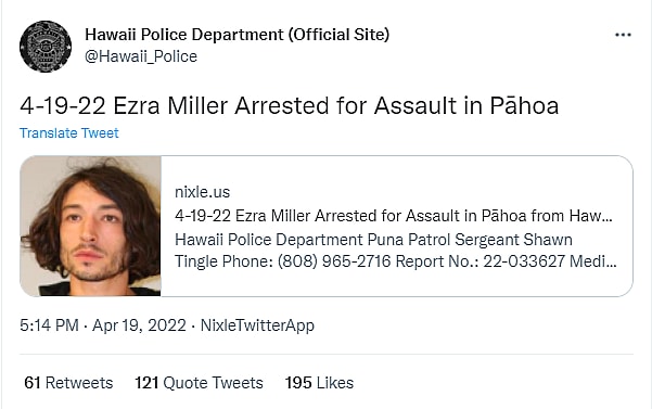 A few nights later on March 27th, the actor “was arrested and charged for disorderly conduct and harassment after an incident at a bar in Hilo,” after “South Hilo patrol officers responded to a report of disorderly patron at a bar on Silva Street” and “determined that the man, later identified as Ezra Miller, became agitated while patrons at the bar began singing karaoke.”