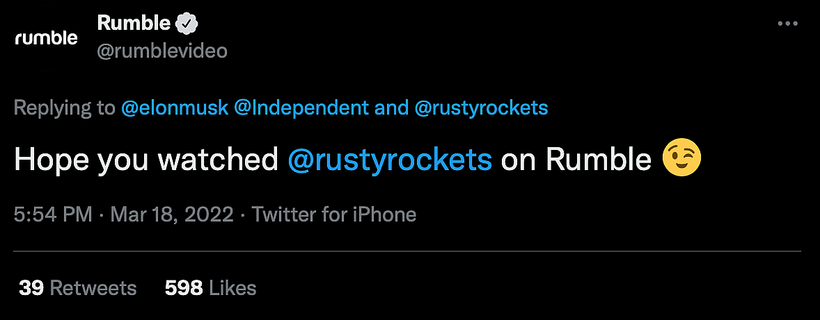 “Hope you watched @rustyrockets on Rumble,” they nudged Brand’s audience.