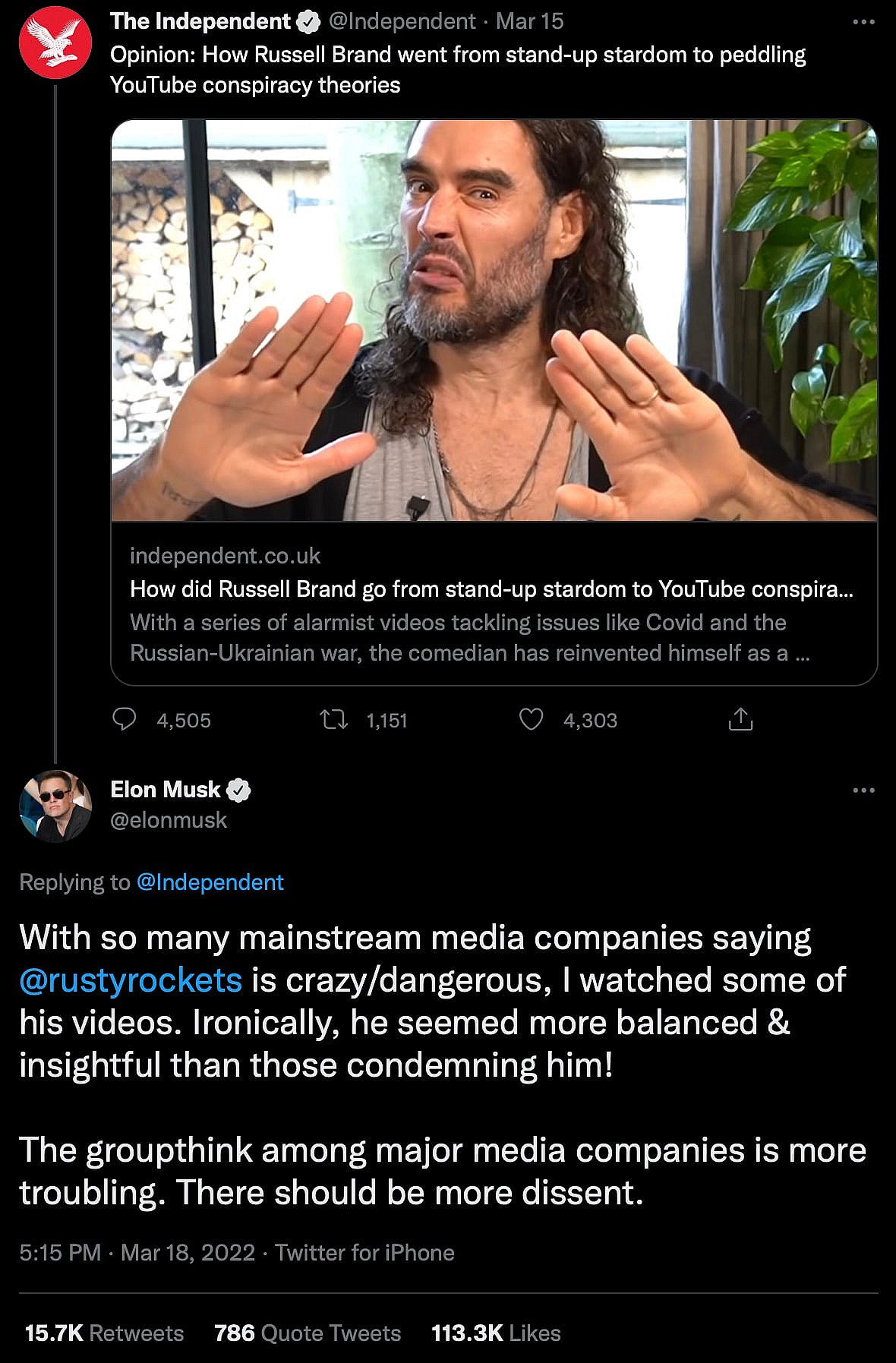 “With so many mainstream media companies saying [Russell Brand] is crazy/dangerous, I watched some of his videos,” wrote Musk. “Ironically, he seemed more balanced & insightful than those condemning him!”