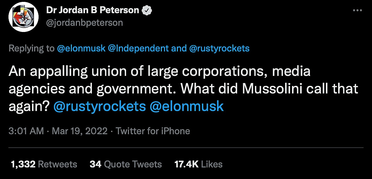 Renowned psychologist and YouTube personality Jordan Peterson agreed with Musk’s assessment, adding, “An appalling union of large corporations, media agencies and government. What did Mussolini call that again?”