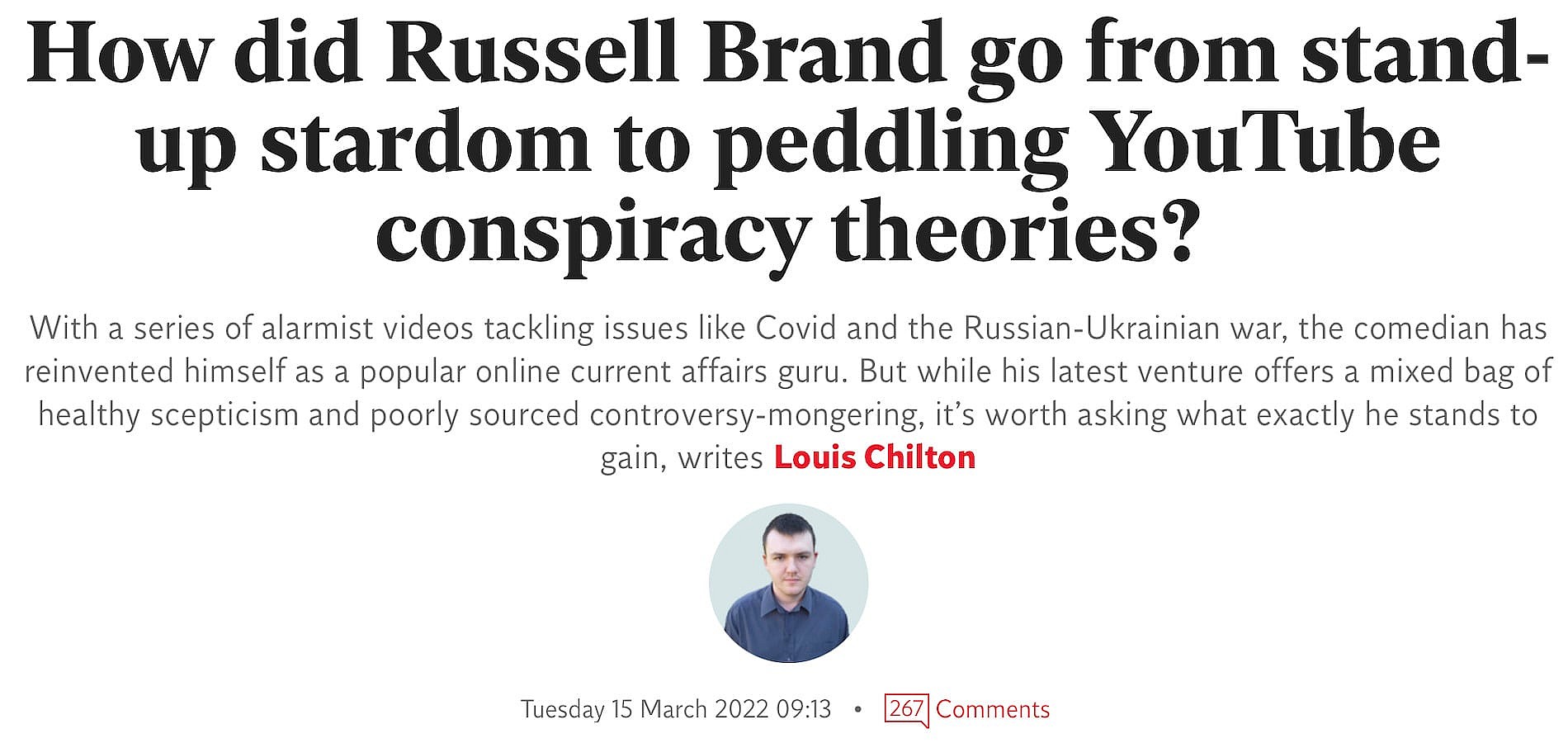 His headline positing the question “How did Russell Brand go from stand-up stardom to peddling YouTube conspiracy theories?”, Chilton’s piece accuses the English comedian of reinventing himself “with a series of alarmist videos tackling issues like Covid and the Russian-Ukranian war,” trivialising Brand’s content as “a mixed bag of healthy scepticism and poorly sourced controversy-mongering.”