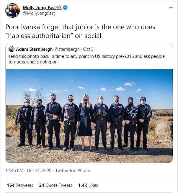 Daily Beast editor Molly Jong-Fast first shared the photo commenting, “Poor ivanka forget that junior is the one who ‘hapless authoritarian’ on social.”