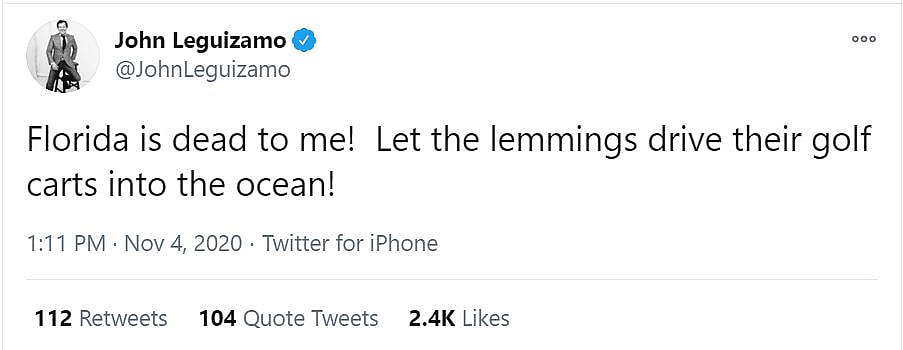 Leguizamo wrote on Twitter, “Florida is dead to me! Let the lemmings drive their golf cars into the ocean!”